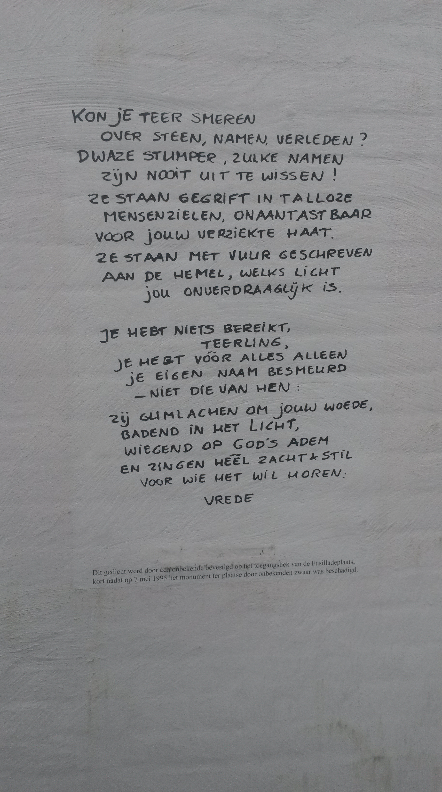 “De salvo’s van de schietbaan klinken steeds vaker, nu ook al tijdens het ochtendappèl. Vanmorgen 2 salvo’s. Na het eerste salvo tel ik de negentien genadeschoten en ik ril over mijn hele lichaam. Mijn onderlip bijt ik stuk om de tranen van woede in te houden, bij de afschuwelijke moordpartijen waaraan nooit een einde schijnt te komen” Bron: Gevangenen in Terreur,