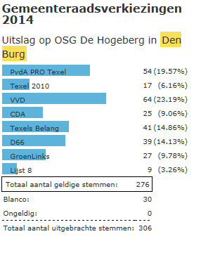 VVD is de winnaar geworden van de scholierenverkiezingen op OSG de Hogeberg met 23,19 % van de stemmen. De PVDA, vier jaar geleden nog de winnaar onder de Texelse scholieren, is 2e geworden met 19,57 % van de stemmen. Landelijk had D66 de meeste stemmen, 19,02% van de landelijke stemmen gingen naar deze partij. De VVD is landelijk 2e geworden met 18,3 van de stemmen. 306 leerlingen brachten hun stem uit.