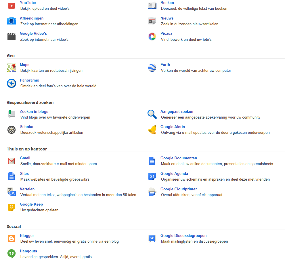 De verschillende Google apps:
