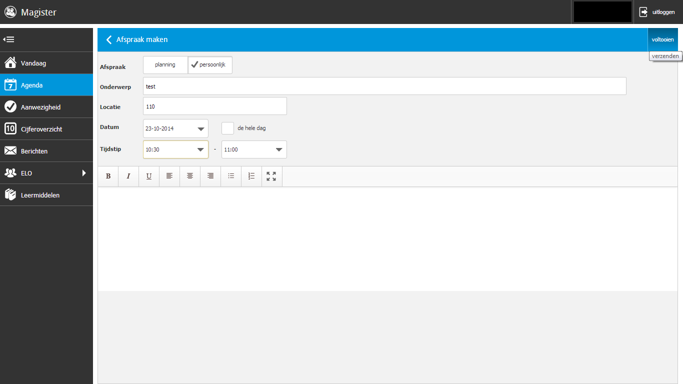 Vul hierbij het onderwerp in, de locatie, datum en het gewenste tijdstip. Je kunt in het grote tekstvak onderaan je planning maken.