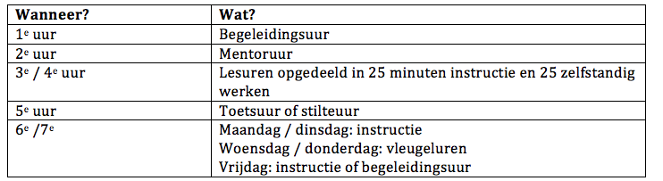 De instructiemomenten zijn opgedeeld in een soort 25 minuten blokken. De docent geeft in principe 25 minuten instructie of doet 25 minuten een klassikale activiteit. Na deze 25 minuten kan de leerling zelfstandig met zijn planner en leerdoelen aan de slag.