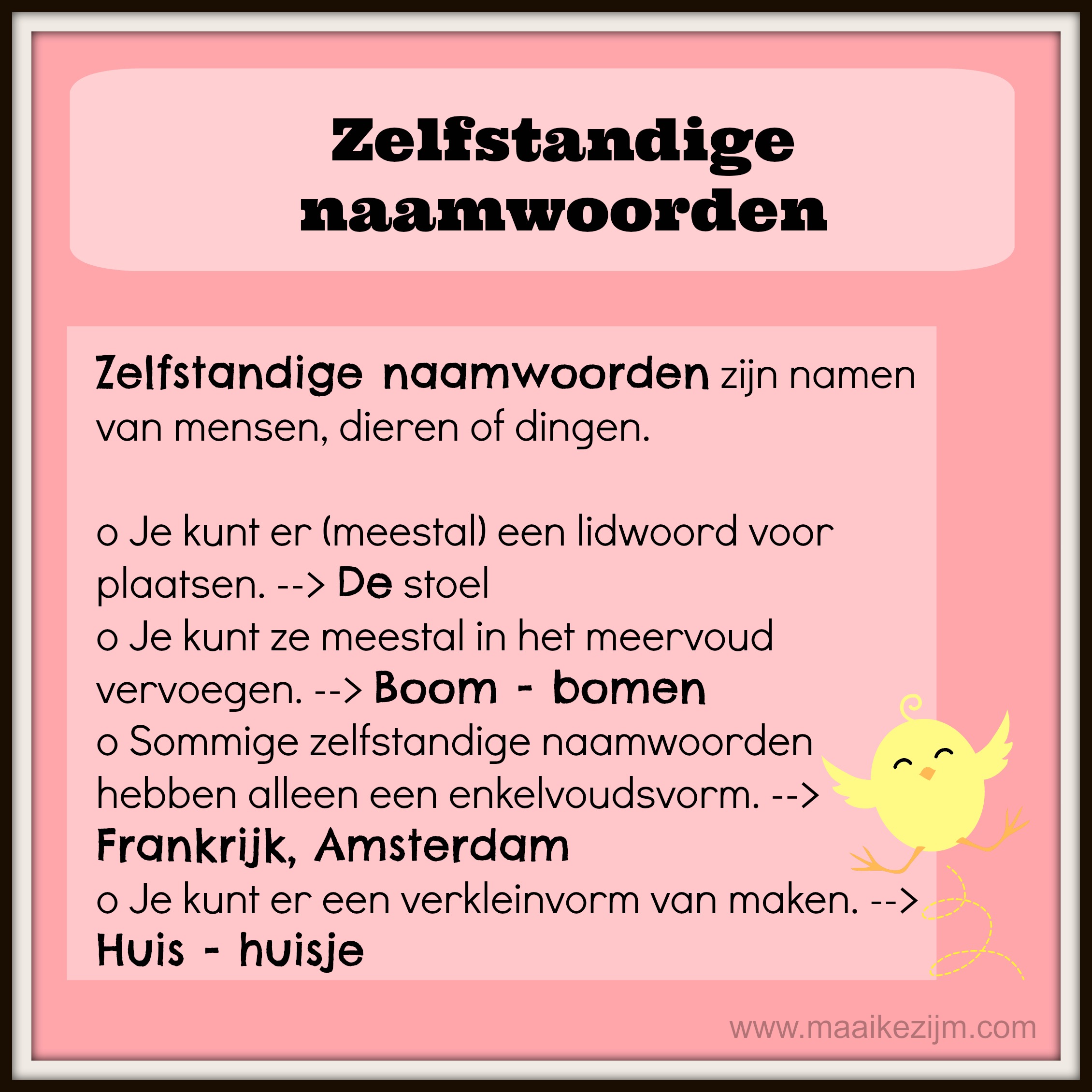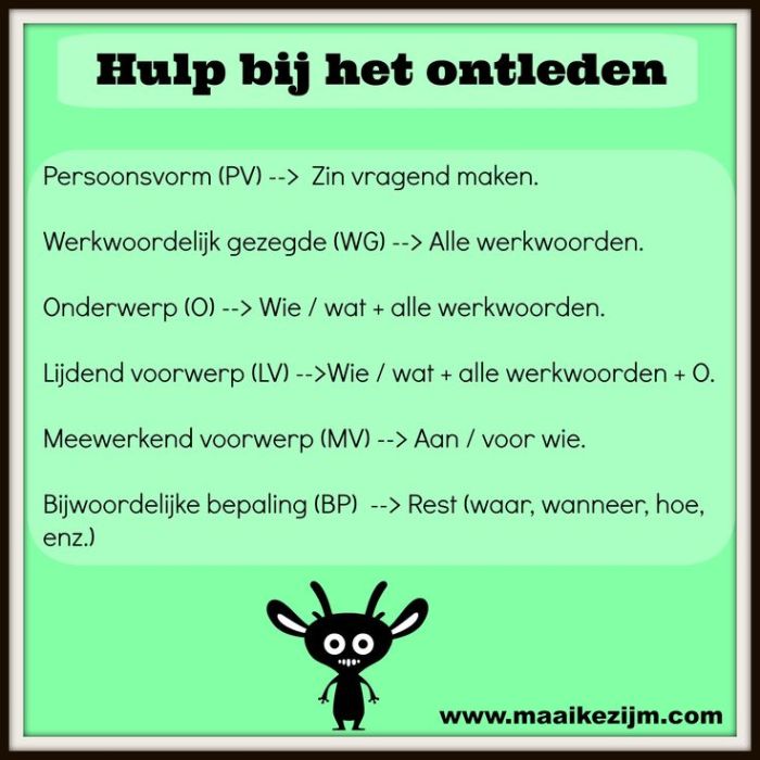 - Woordsoorten: lidwoorden, zelfstandig naamwoord, bijvoeglijk naamwoord