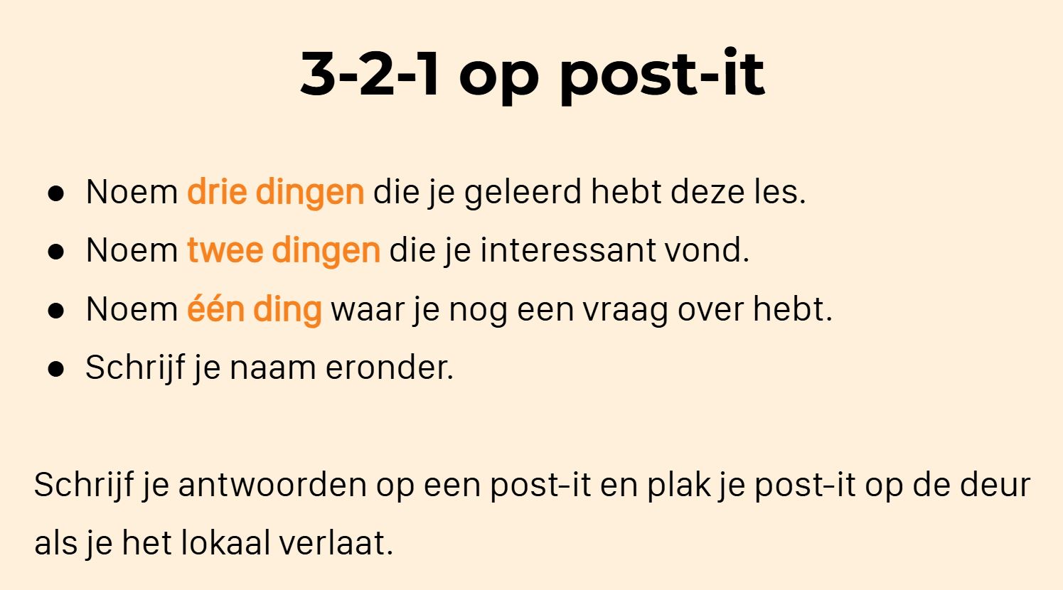 Dit kan ook op een kaartje als exit ticket. Maar kan ook digitaal goed met bijvoorbeeld LessonUp, Nearpod of Socrative.